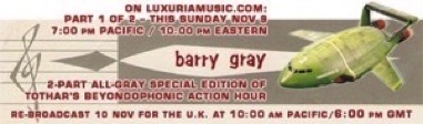 From 2008 DJ Michael Toth played Barry Gray music in a series of 1 hour specials on Luxuriamusic internet radio.